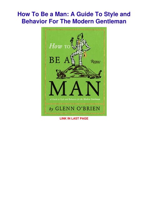 Read Online How To Be a Man A Guide To Style and Behavior For The Modern Gentleman PDF online is a convenient and frugal way to read How To Be a Man A Guide To Style and Behavior For The Modern Gentleman you love right from the comfort of your own home. Yes, there sites where you can get PDF "for free" but the ones listed below are clean from viruses and completely legal to use.